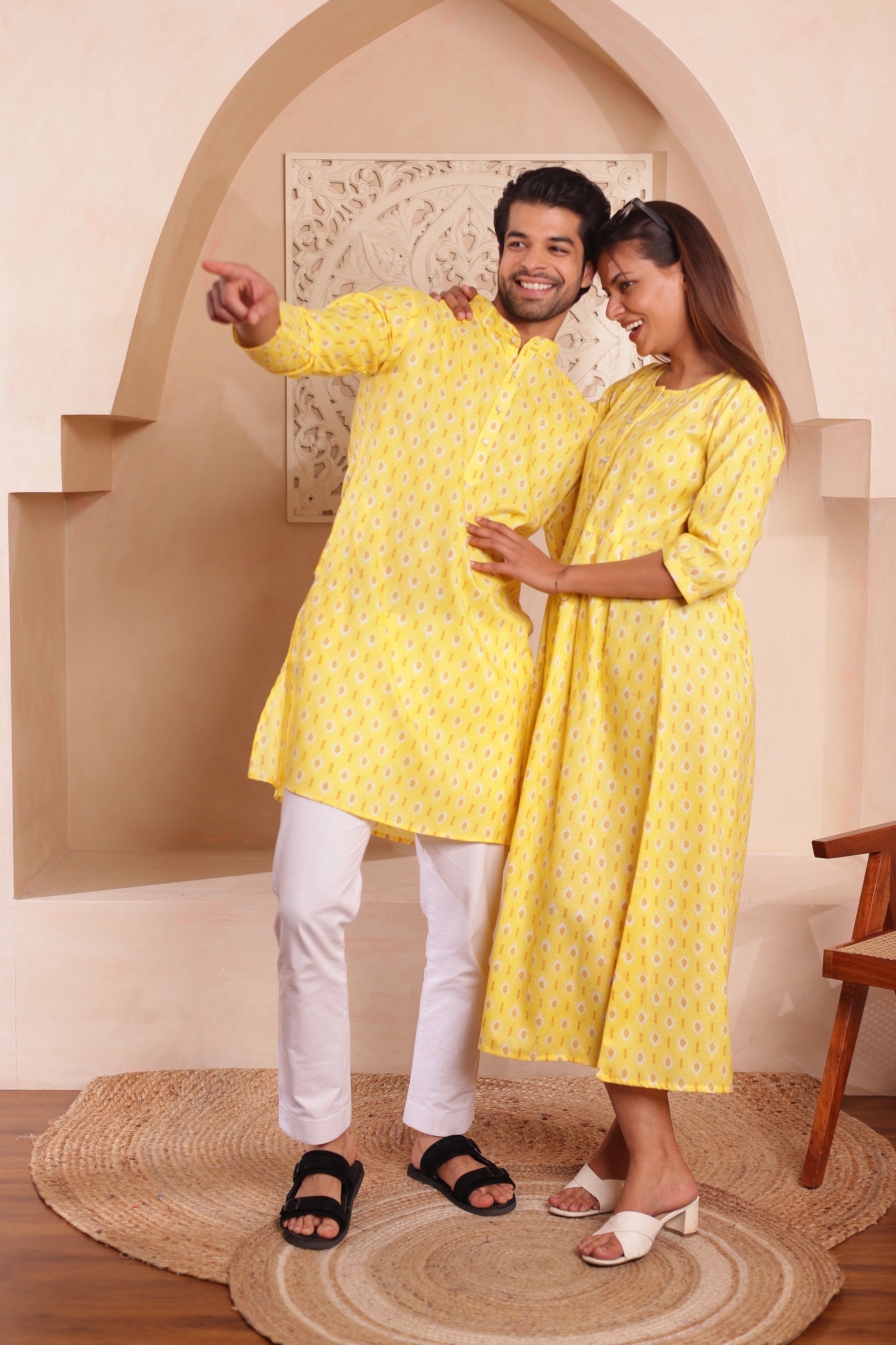 This traditional matching family outfit is more than just clothing — it’s a celebration of culture and connection. Whether it’s father-son twinning in ethnic kurtas or mother-daughter twinning in graceful dresses, the vibrant yellow adds joy and auspiciousness to your celebrations.