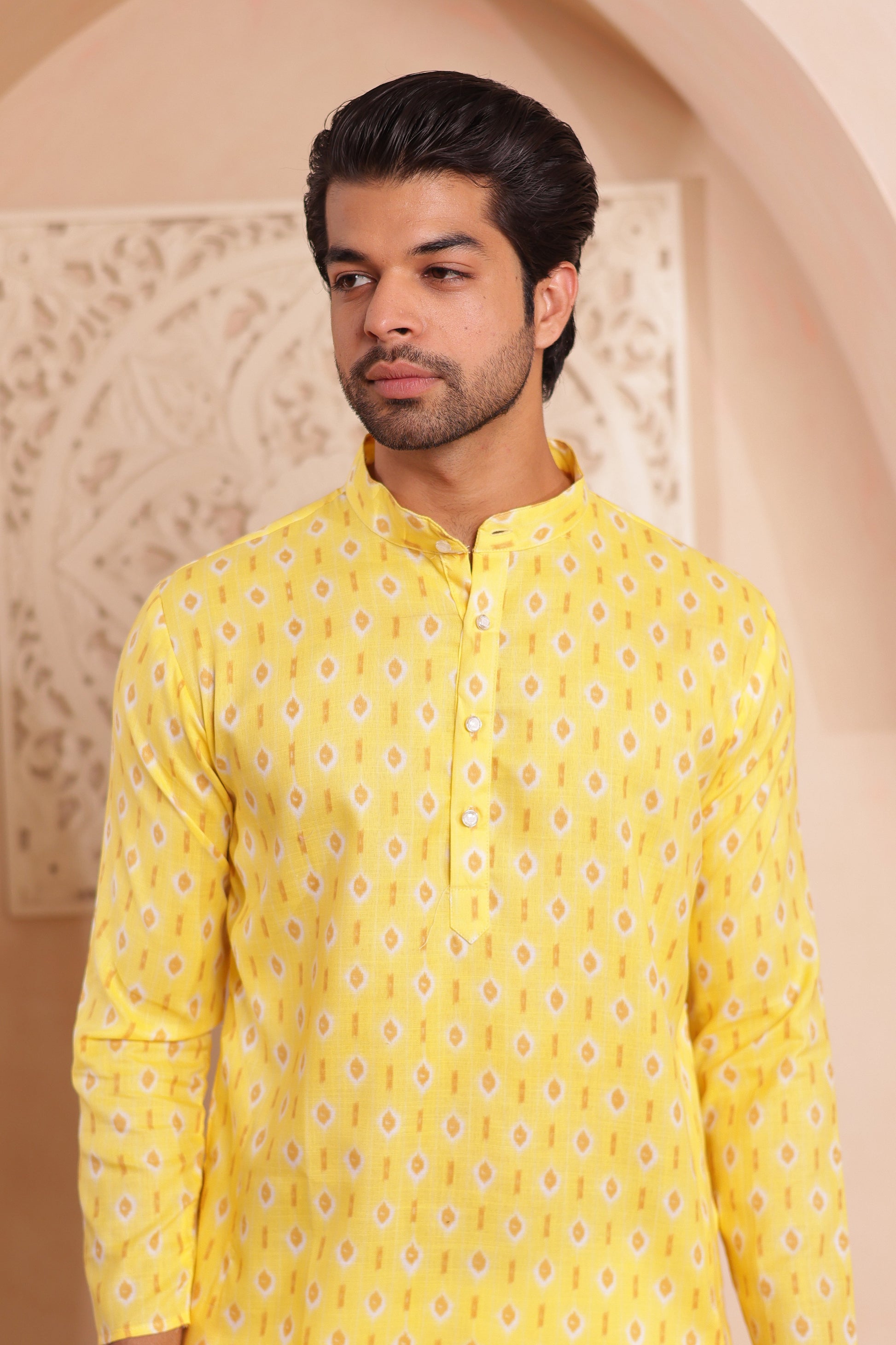 o Men’s Ethnic Kurta – Elegant yellow Ikat kurta with white trousers (perfect for traditional occasions)