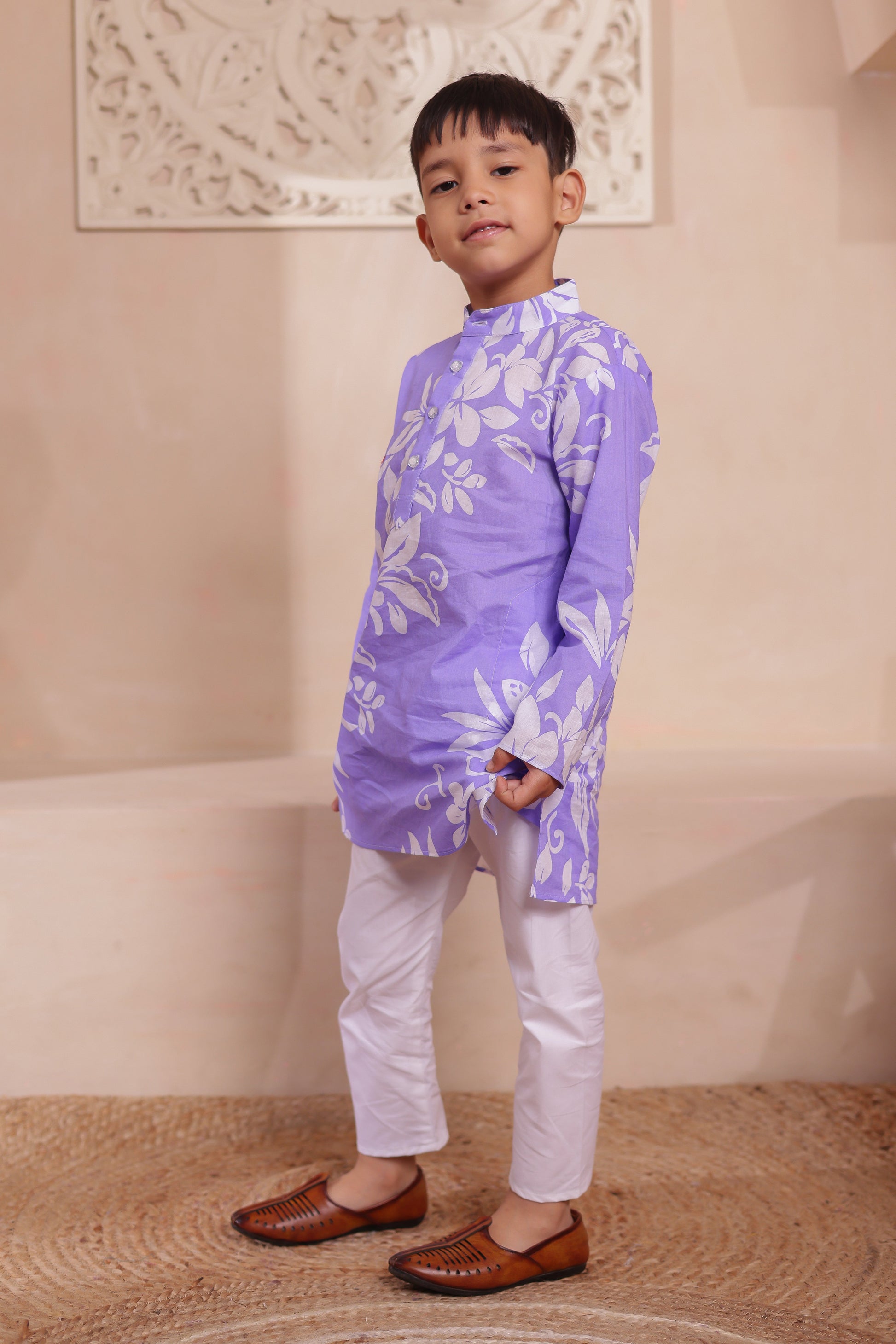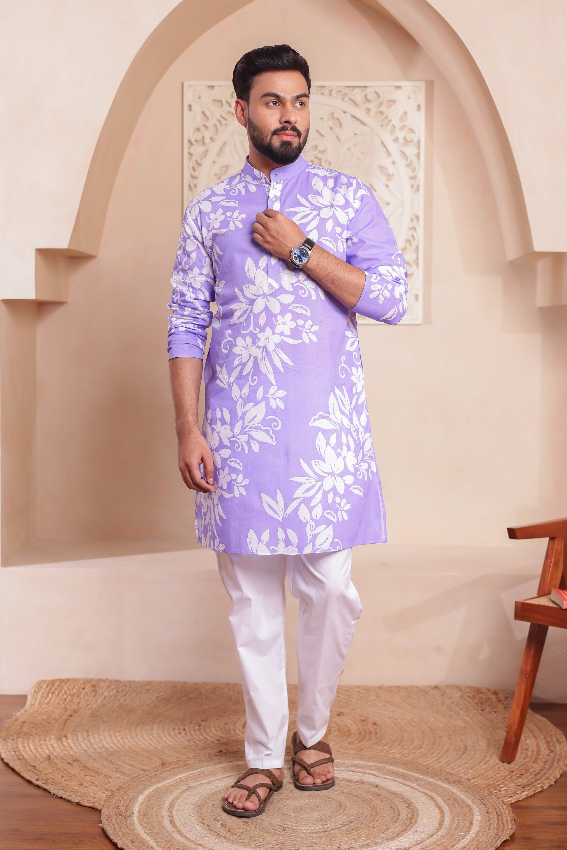 o Men’s Ethnic Kurta: Sophisticated lavender kurta with white floral prints, paired with white trousers (ideal for traditional celebrations)