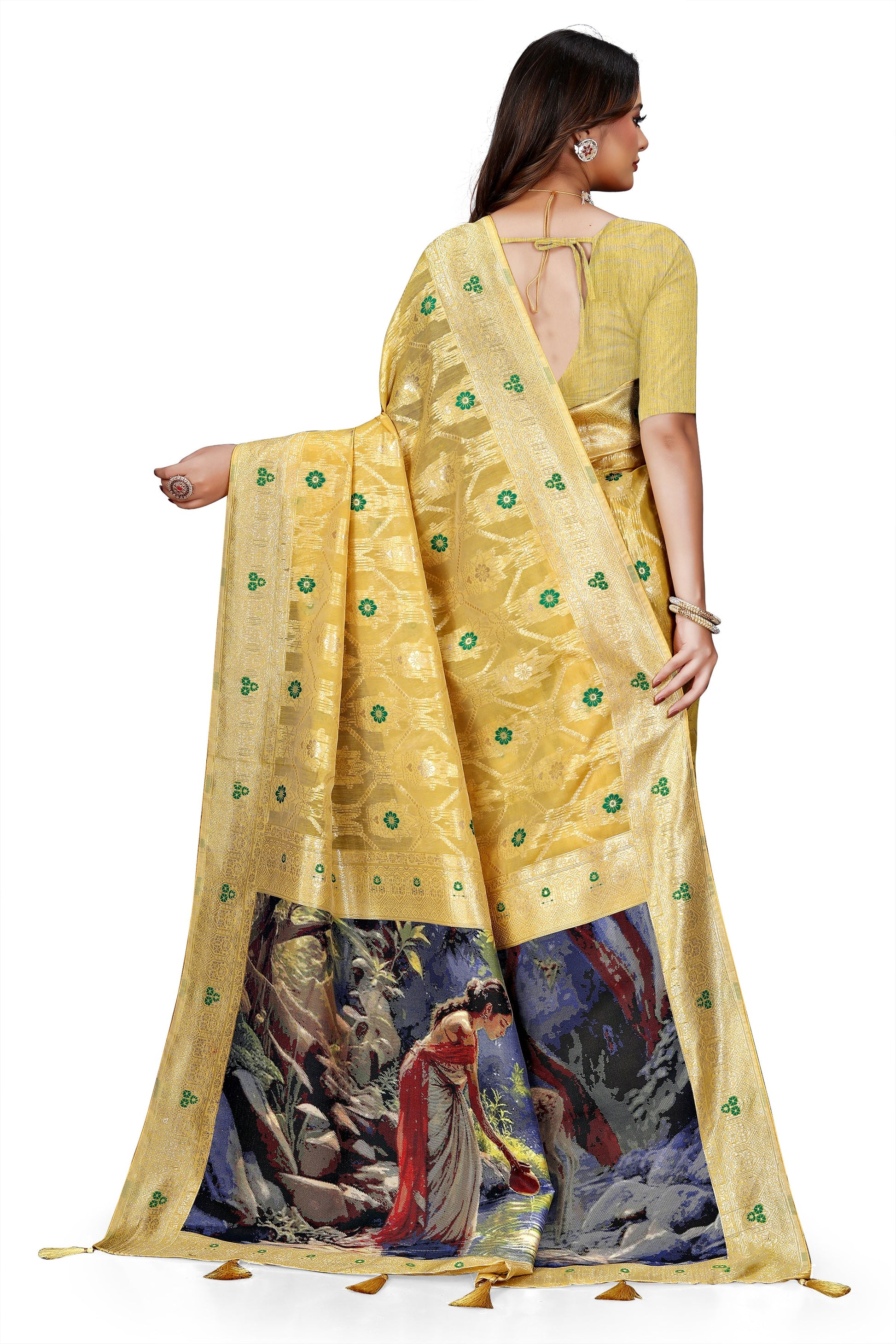 OWLSKY, SASSY & STYLO Jacquard Saree for Women | Elegant Weaving Work | Jacquard Silk Saree with Unstitched Blouse for Women | Unique Digital Pallu Art Yellow
